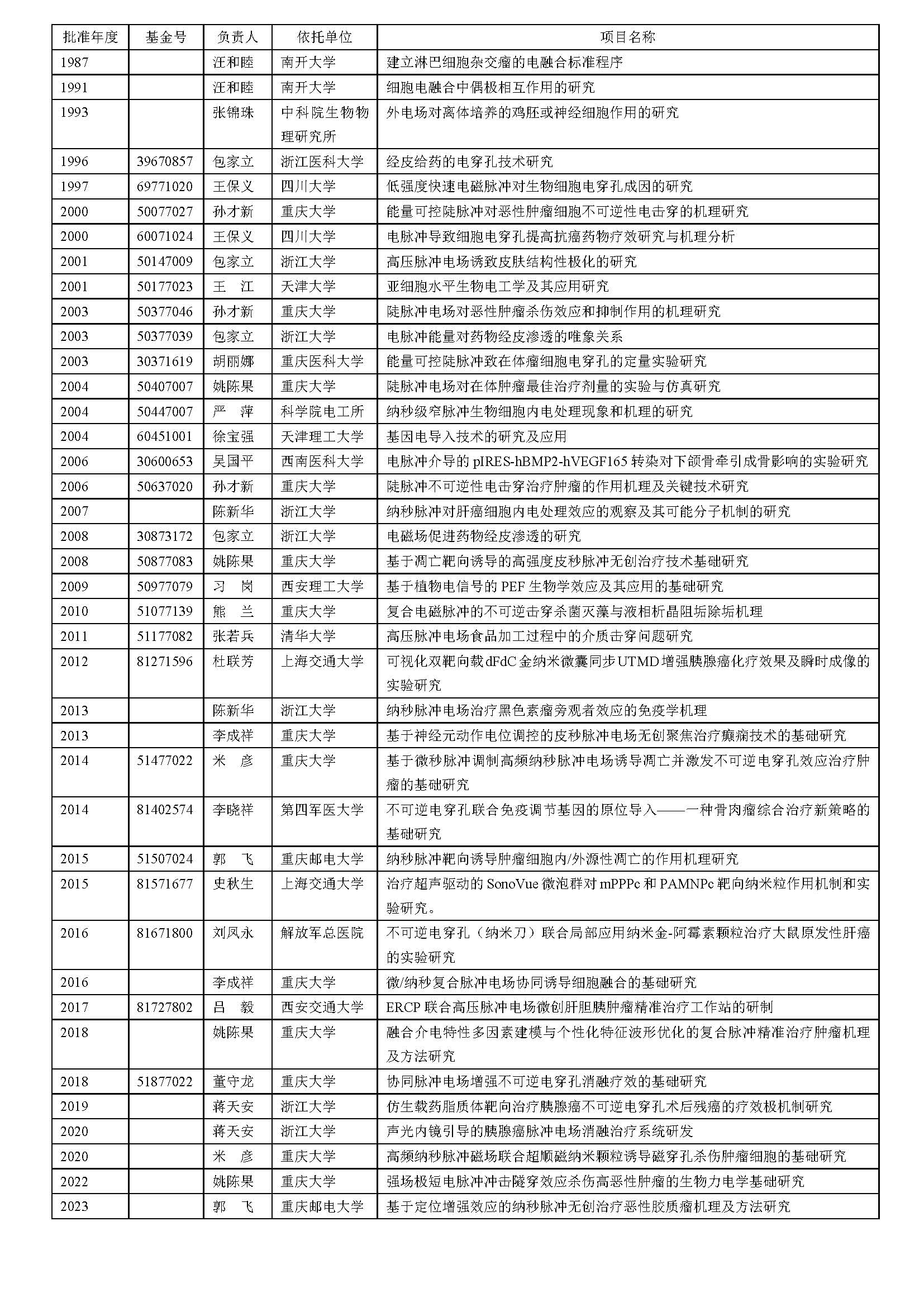国家自然科学基金会资助电穿孔,不可逆电穿孔以及相关课题一览表